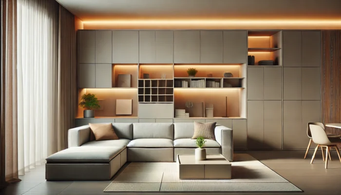 • Living Areas: Modular shelves and hidden storage coffee tables.